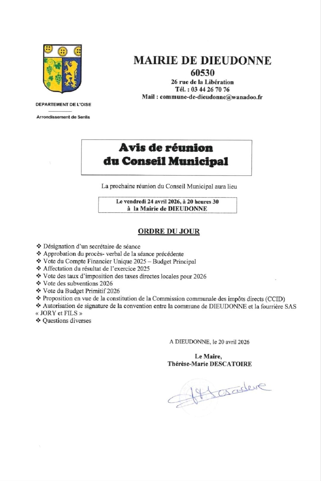 Avis de réunion du Conseil Municipal